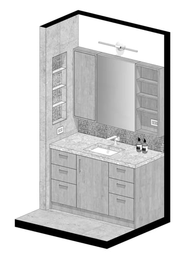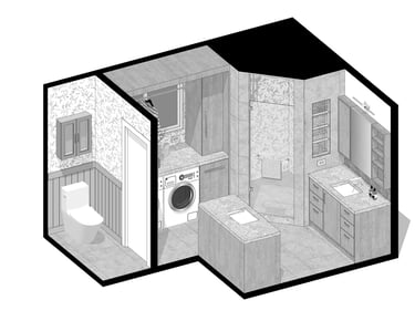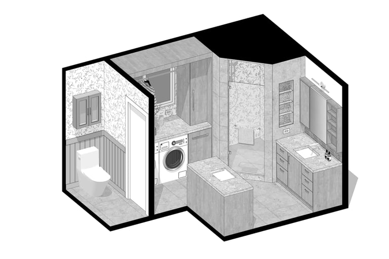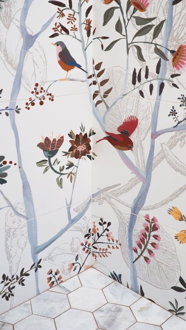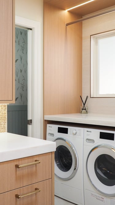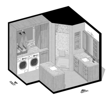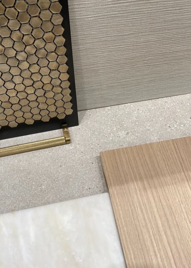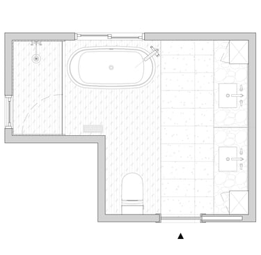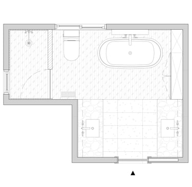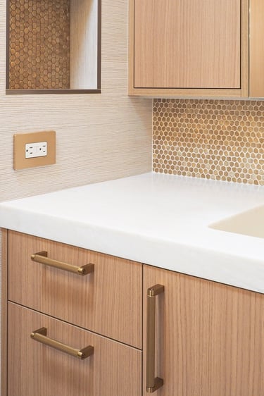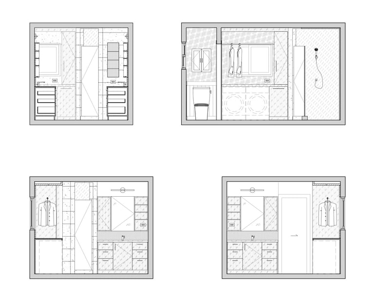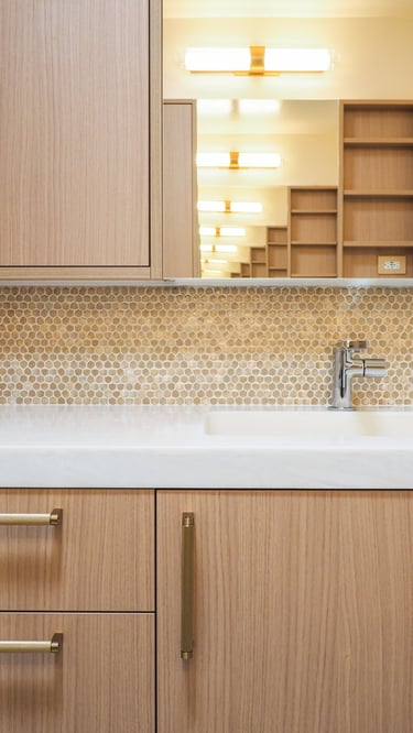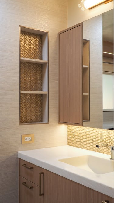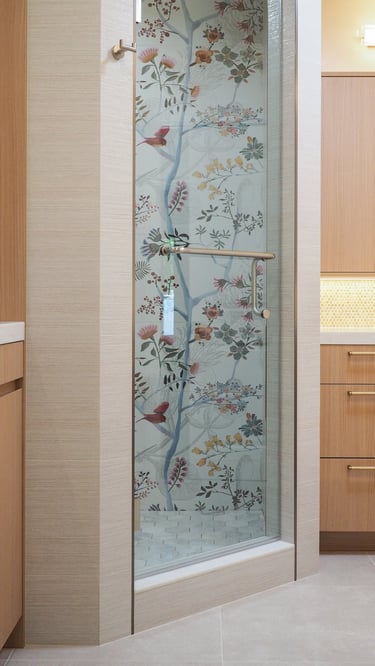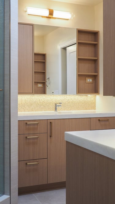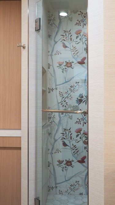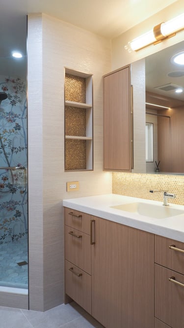 The design of this master bathroom reflects the contrasting preferences of the homeowners. The male owner favors a simple, stable design, while the female owner enjoys bold patterns and golden accents. I used relaxing wood textures and earth tones to balance these tastes for the overall space, incorporating golden elements in the backsplash, hardware, and sconces. Bold tiles and rich wallpapers were chosen for the shower room and toilet to cater to their individual personalities.