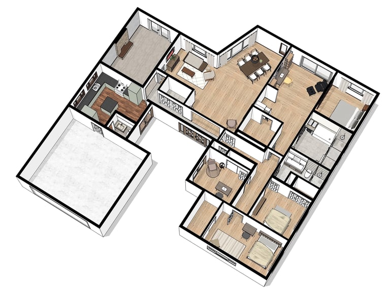 My design approach redefined the space, introducing new furniture arrangements, a cohesive color palette, thoughtful material selections, refined lighting schemes, and upgraded bathroom designs and renovations.