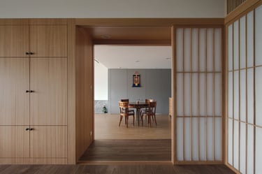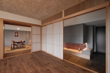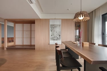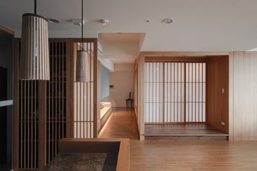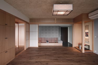 Inspired by traditional Japanese hot spring houses, we aimed to create a serene and tranquil atmosphere. Using wood textures as the primary design element, we infused the space with a Japanese Zen aesthetic. The layout includes an elevated floor area designed as a Washitsu(tatami room), serving multiple purposes: accommodating overnight guests and providing a meeting space for the owner's work needs.