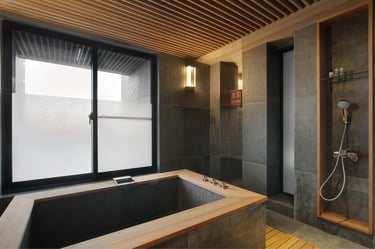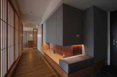 The design incorporates Japanese style with subtle lighting accents. The warm wood tones are complemented by gray stone, tiles, and fabrics, adding depth and character. Thoughtfully displayed, the owner's personal collection gives the space a unique personality that balances tranquility with dynamic functionality.