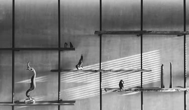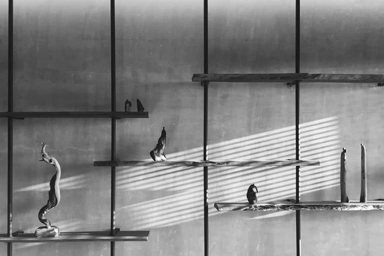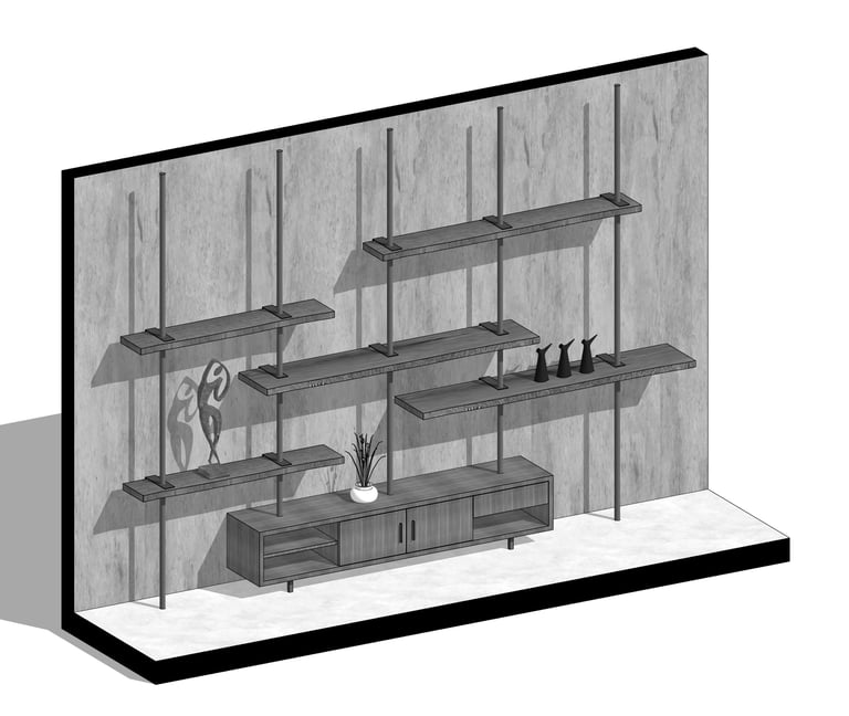 To highlight this collection, a bespoke shelf wall was crafted in the main living space frequented by the family. This distinctive design marries the homeowner's lignum vitae collection with intricate ironwork details. A sleek black round iron pipe extends seamlessly from floor to ceiling, revealing natural cement beneath the scraped-off white wall paint, forming a tactile facade. Coupled with thoughtfully placed ceiling lighting, this design choice accentuates texture and depth. Once the owner's collection finds its place, it uniquely showcases their hobbies and discerning taste.