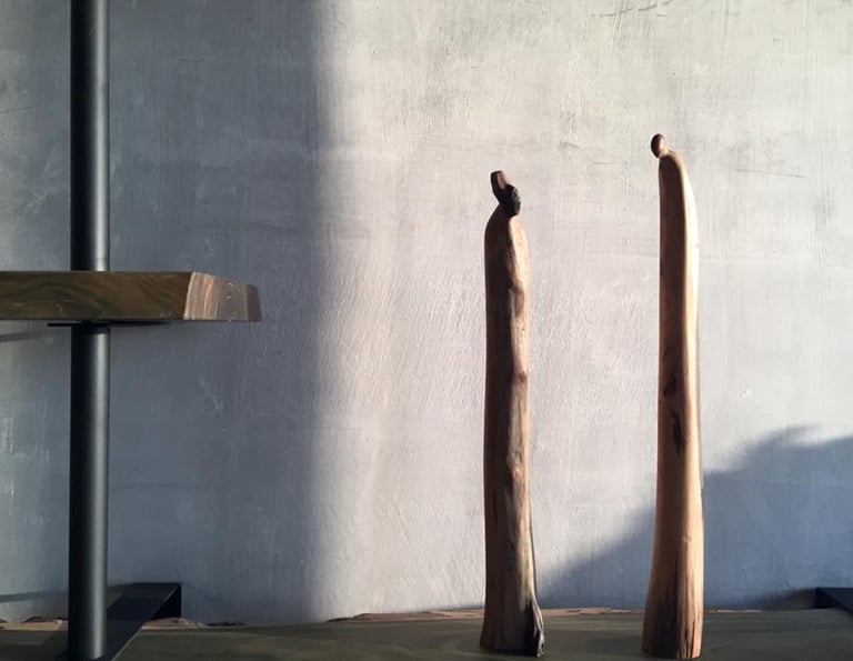 The homeowner has a passion for collecting wood and sculptures, often discussing recent acquisitions and seeking advice on incorporating these treasures into their home design.