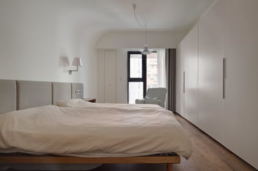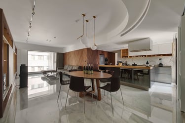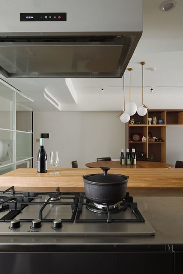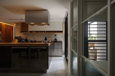 Initially, we collectively decided to open up the front bedroom by removing part of the partition wall, expanding the living and dining areas, and introducing glass partitions for seamless visibility. I also reworked the second room, accommodating kitchen essentials like the refrigerator and electrical cabinets. This layout yielded a 10-foot kitchen countertop space, an 8.5-foot island bar, and a dining space for at least 6—an ideal setup for culinary enjoyment and hosting gatherings.
