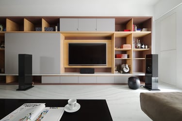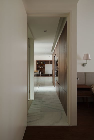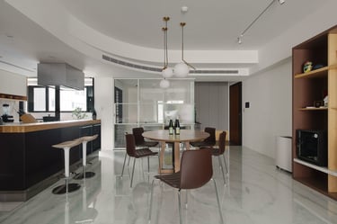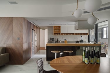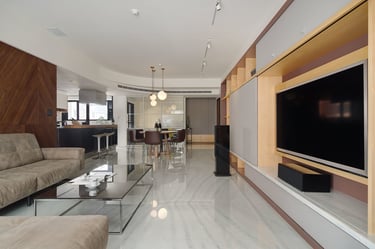 Additionally, I planned a 20-foot light-colored display cabinet in the living room, blending with the TV wall and complementing the dark wood chevron pattern. This and the hidden door designs enhanced the sense of continuity and spaciousness. Employing glossy stone floors, dark and light wood textures, gray paint, and stainless kitchen cabinets created an elegant, tranquil ambiance, beautifully showcasing the owners' personal collections and infusing the home with their distinct tastes.