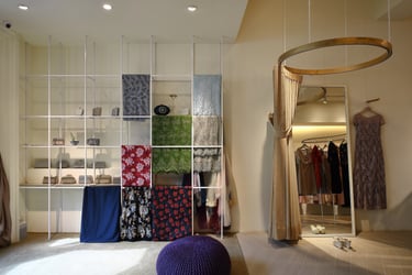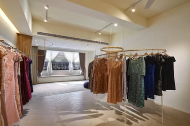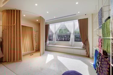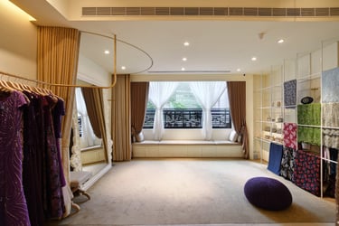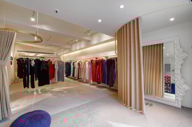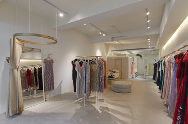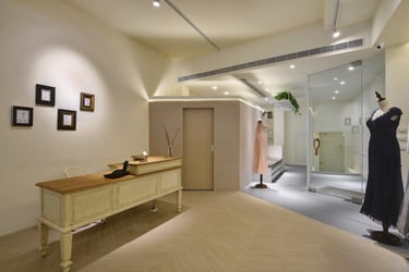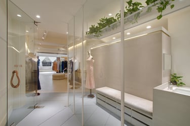 To maintain the brand's inviting feel, I strategically positioned the entrance after a deliberate stroll through a window display and greenery area. This sets the tone and serves as the initial brand encounter. Leveraging the elongated layout, I've divided the space into three sections: the reception and work area, the display zone, and the final try-on and relaxation space. I've used flooring transitions for spatial distinction and incorporated a 30-foot display rod to visually expand the area.