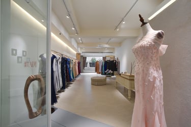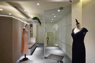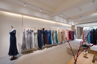 This is a rental dress shop catering to mothers of newlyweds, distinct from bridal gown boutiques. Located on Taipei City's bustling second floor, the space is elongated. My approach centers on a welcoming brand image and accessible clothing choices, shaping my design direction.